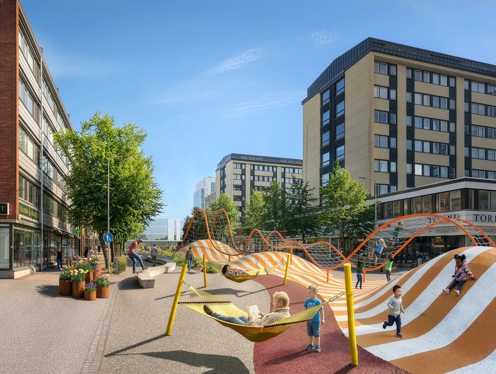 Leikkikadun ympärillä, kadun molemmin puolin, löytyvät lapsiperheiden käyttämät palvelut, kuten eväiden syöntipaikat, erilaiset palvelut, kahvilat ja pienet putiikit. Näin ruuhkavuosia viettävät vanhemmat – ja toki kaikki muutkin kaupunkilaiset – voivat hoitaa arkisia asioita vähän kuin vahingossa.